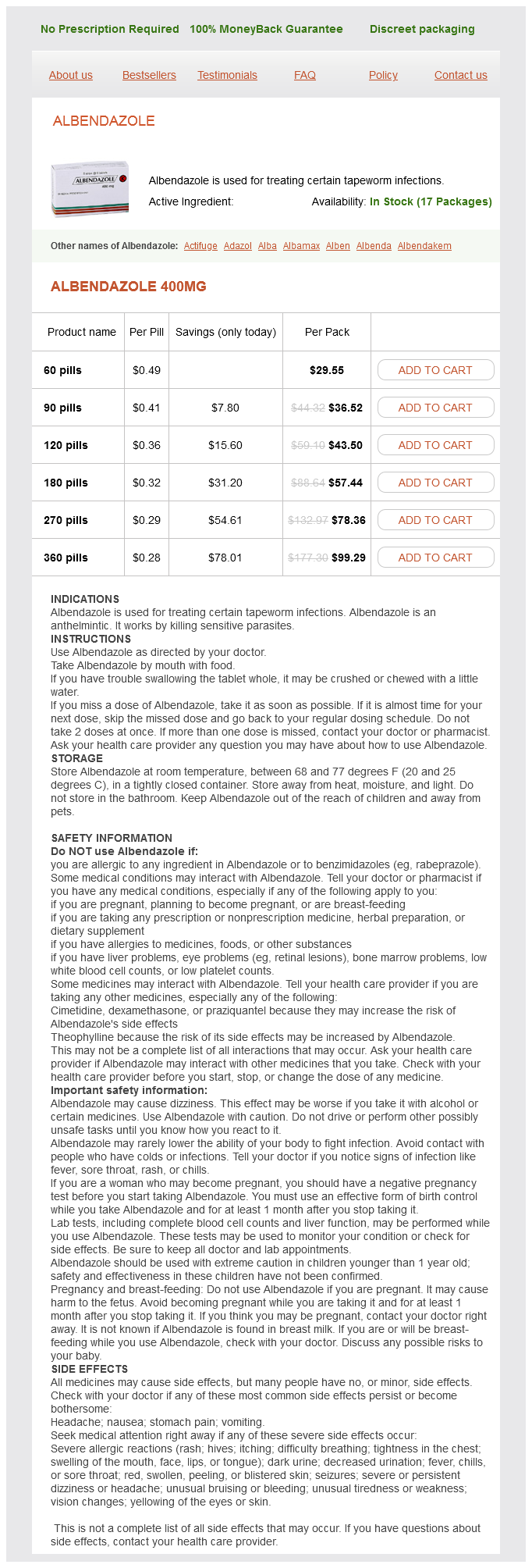 Albendazole packs: 60 pills, 90 pills, 120 pills, 180 pills, 270 pills, 360 pills