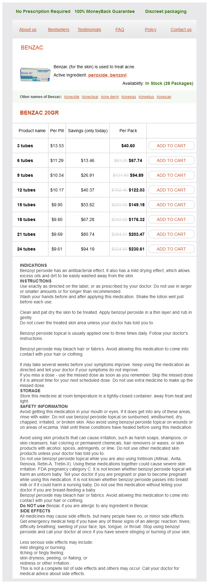Benzoyl Peroxide packs: 3 tubes, 6 tubes, 9 tubes, 12 tubes, 15 tubes, 18 tubes, 21 tubes, 24 tubes