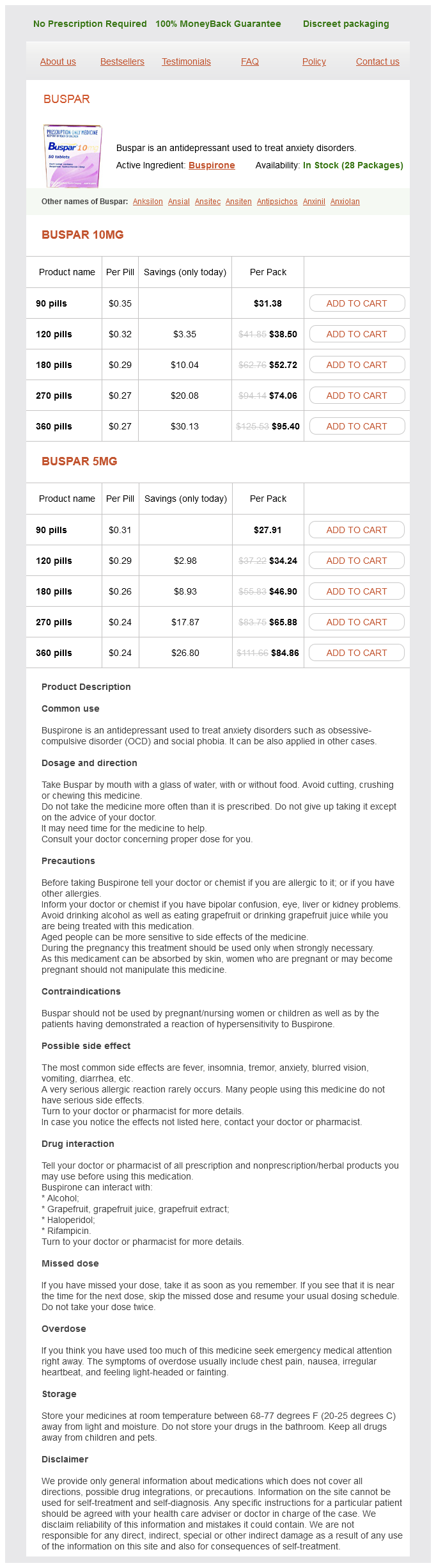 Buspirone packs: 90 pills, 120 pills, 180 pills, 270 pills, 360 pills