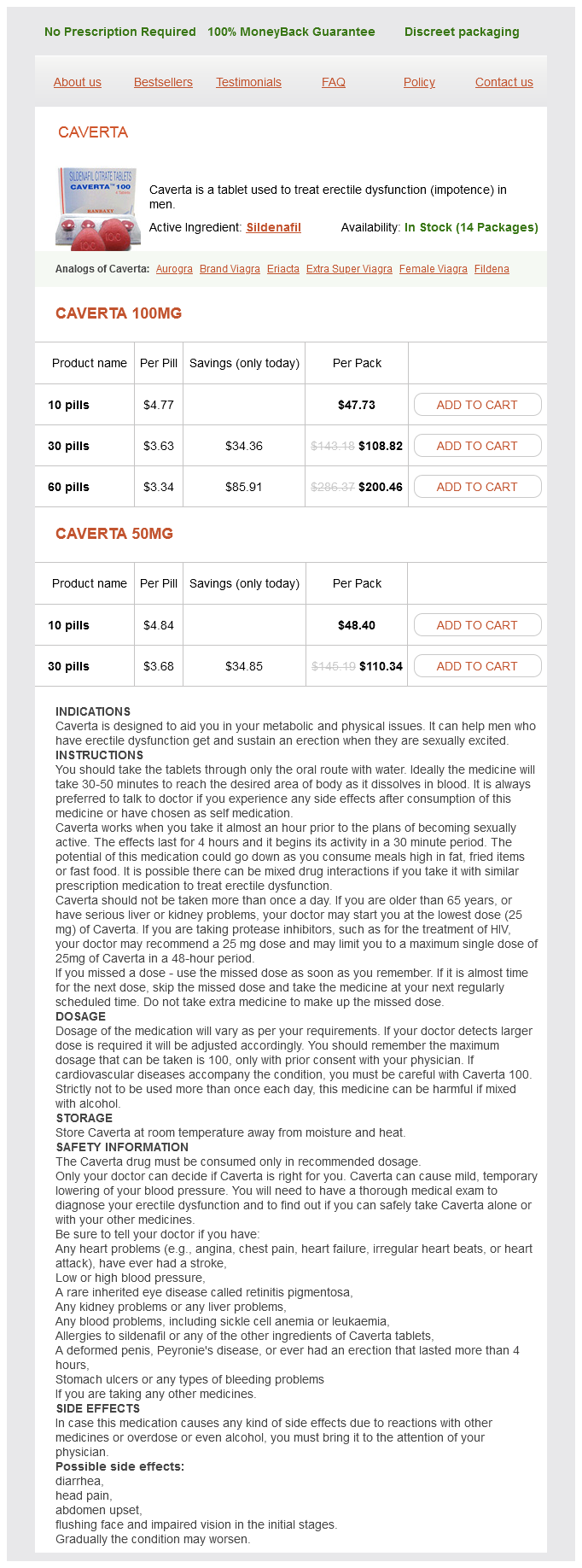 Caverta packs: 10 pills, 30 pills, 60 pills