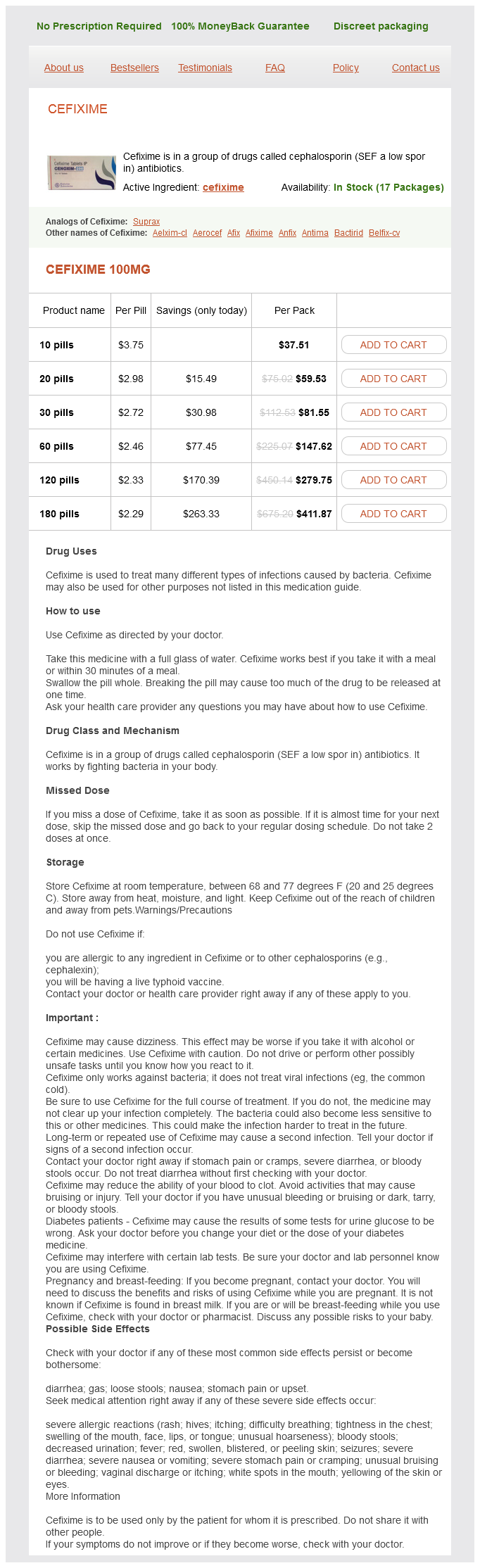 Cefixime packs: 10 pills, 20 pills, 30 pills, 60 pills, 120 pills, 180 pills