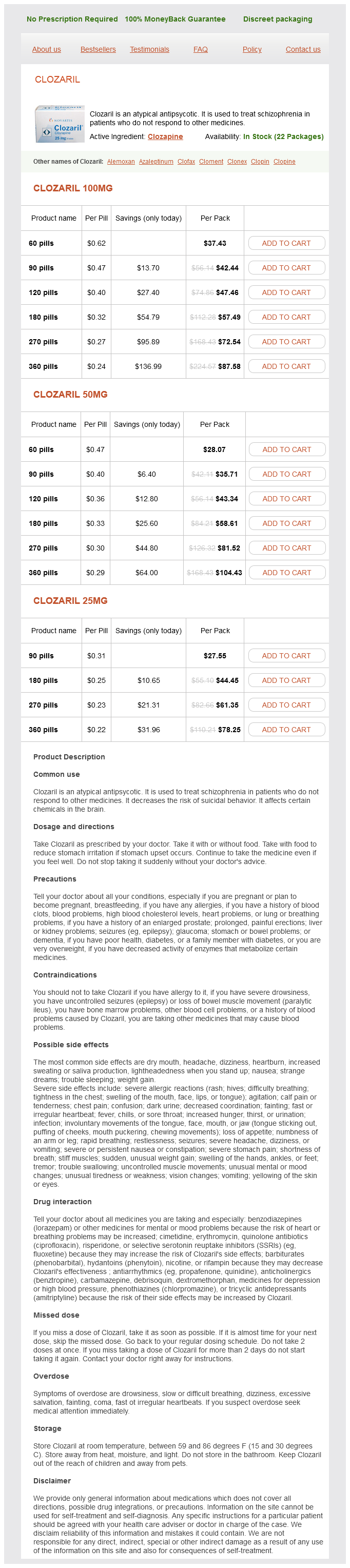 Clozapine packs: 60 pills, 90 pills, 120 pills, 180 pills, 270 pills, 360 pills