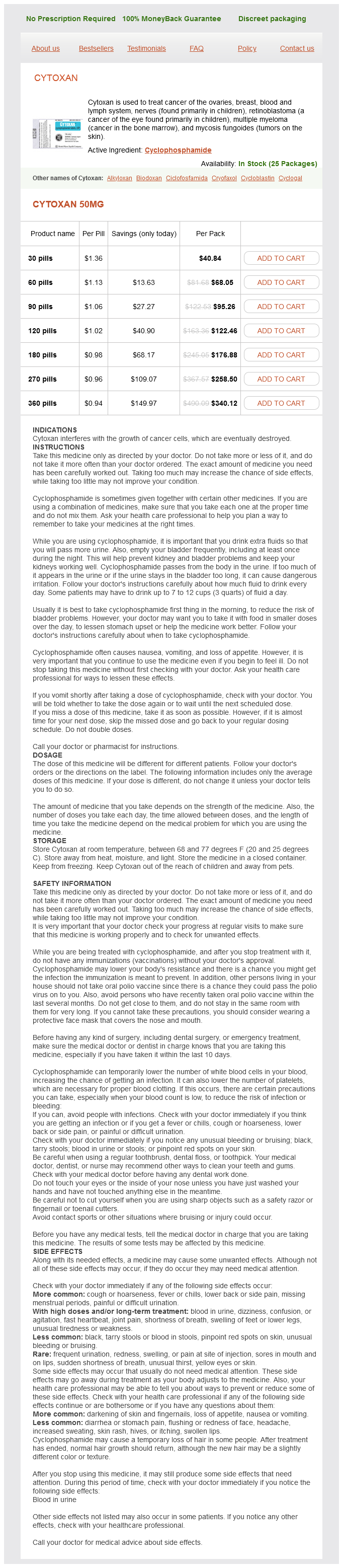 Cyclophosphamide packs: 30 pills, 60 pills, 90 pills, 120 pills, 180 pills, 270 pills, 360 pills