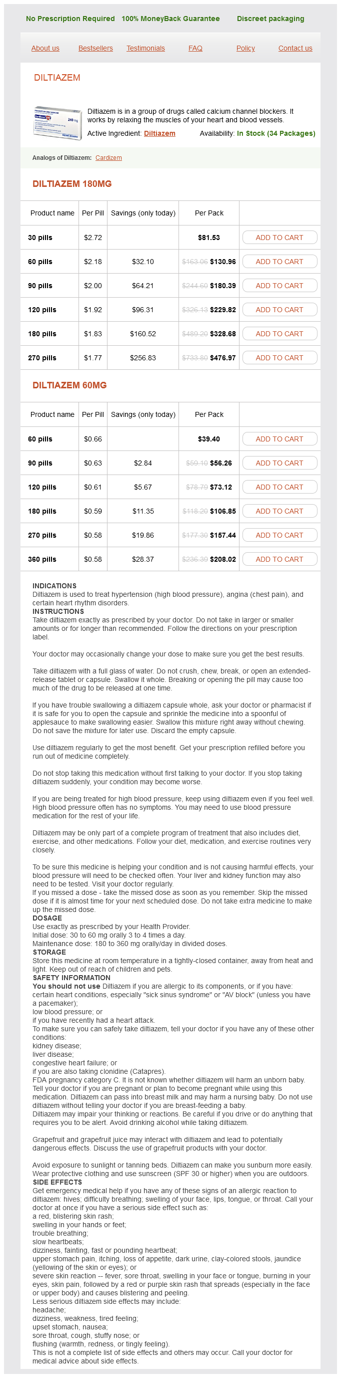 Diltiazem packs: 30 pills, 60 pills, 90 pills, 120 pills, 180 pills, 270 pills, 360 pills