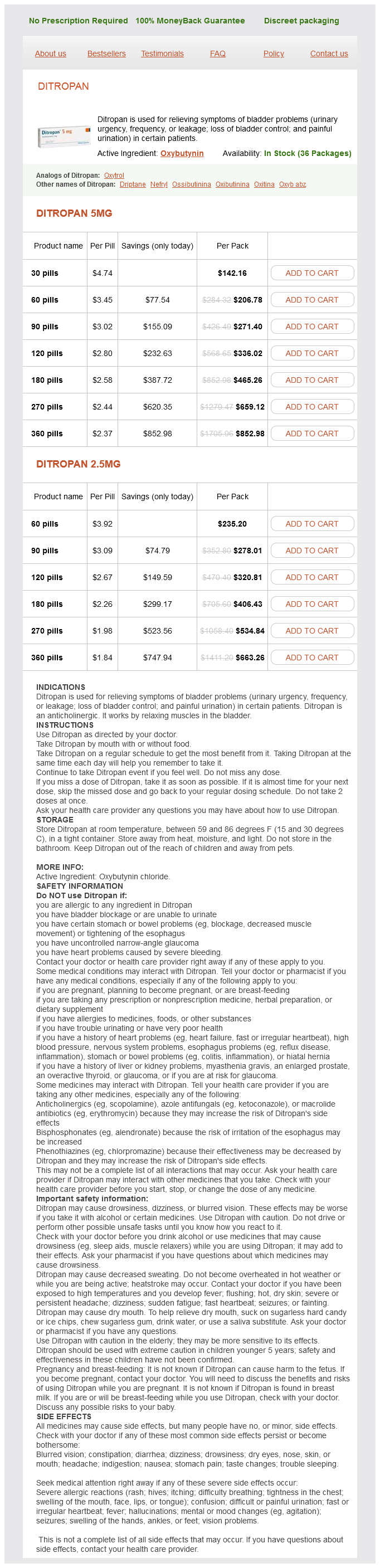Ditropan packs: 30 pills, 60 pills, 90 pills, 120 pills, 180 pills, 270 pills, 360 pills
