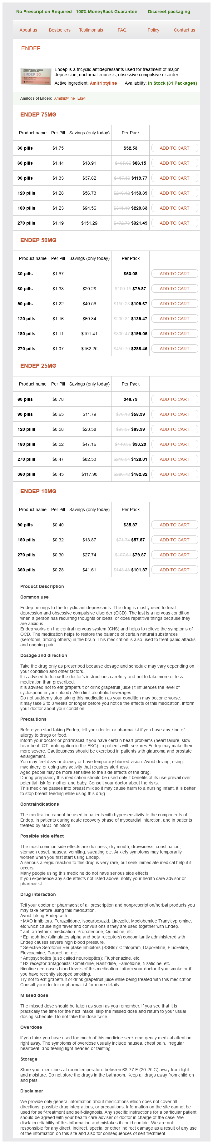 Endep packs: 30 pills, 60 pills, 90 pills, 120 pills, 180 pills, 270 pills, 360 pills