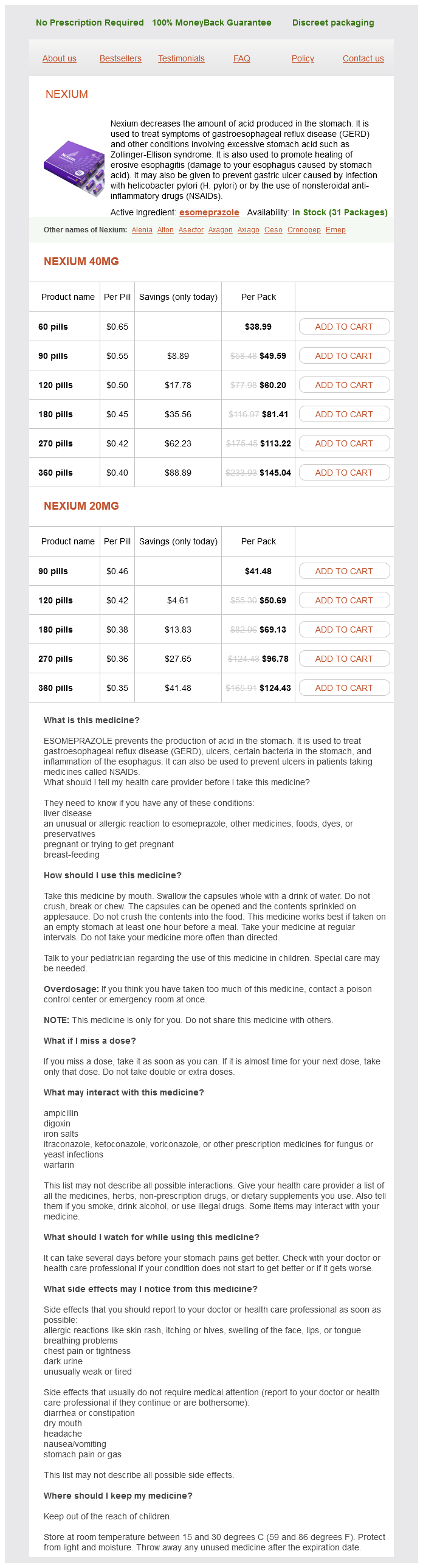 Esomeprazole packs: 60 pills, 90 pills, 120 pills, 180 pills, 270 pills, 360 pills