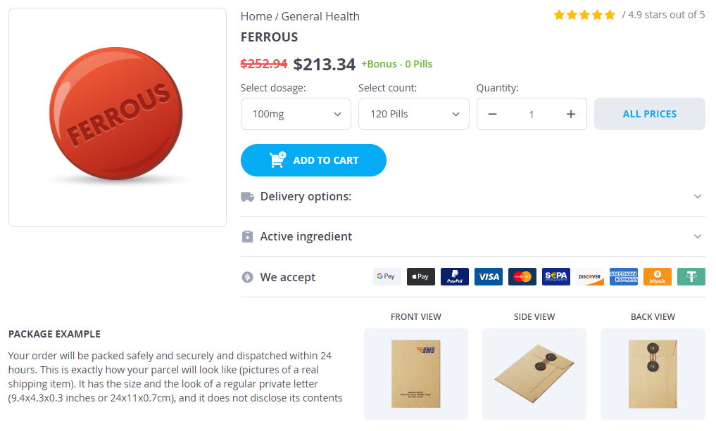 Ferrous packs: 30 pills, 60 pills, 120 pills, 240 pills, 300 pills