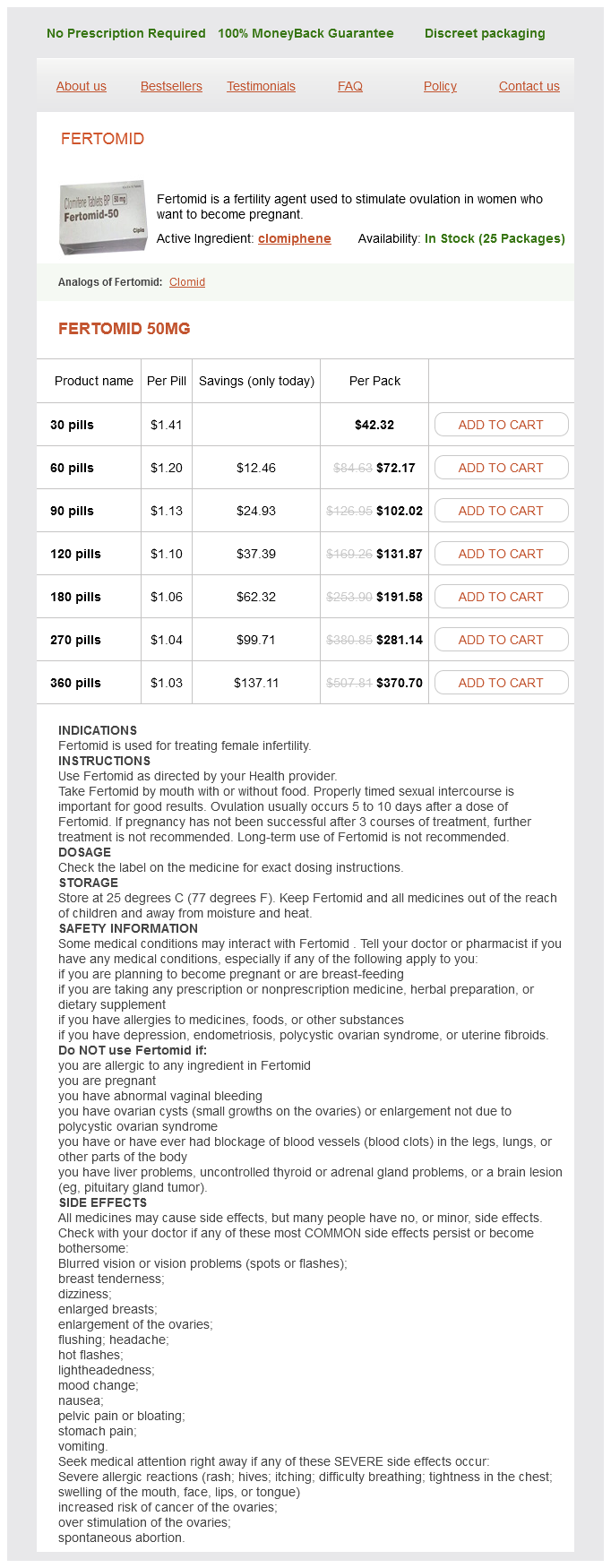 Fertomid packs: 30 pills, 60 pills, 90 pills, 120 pills, 180 pills, 270 pills, 360 pills
