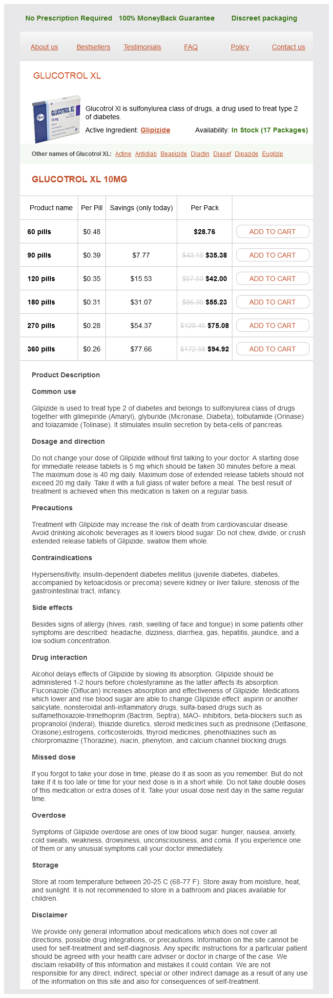 Glipizide packs: 60 pills, 90 pills, 120 pills, 180 pills, 270 pills, 360 pills