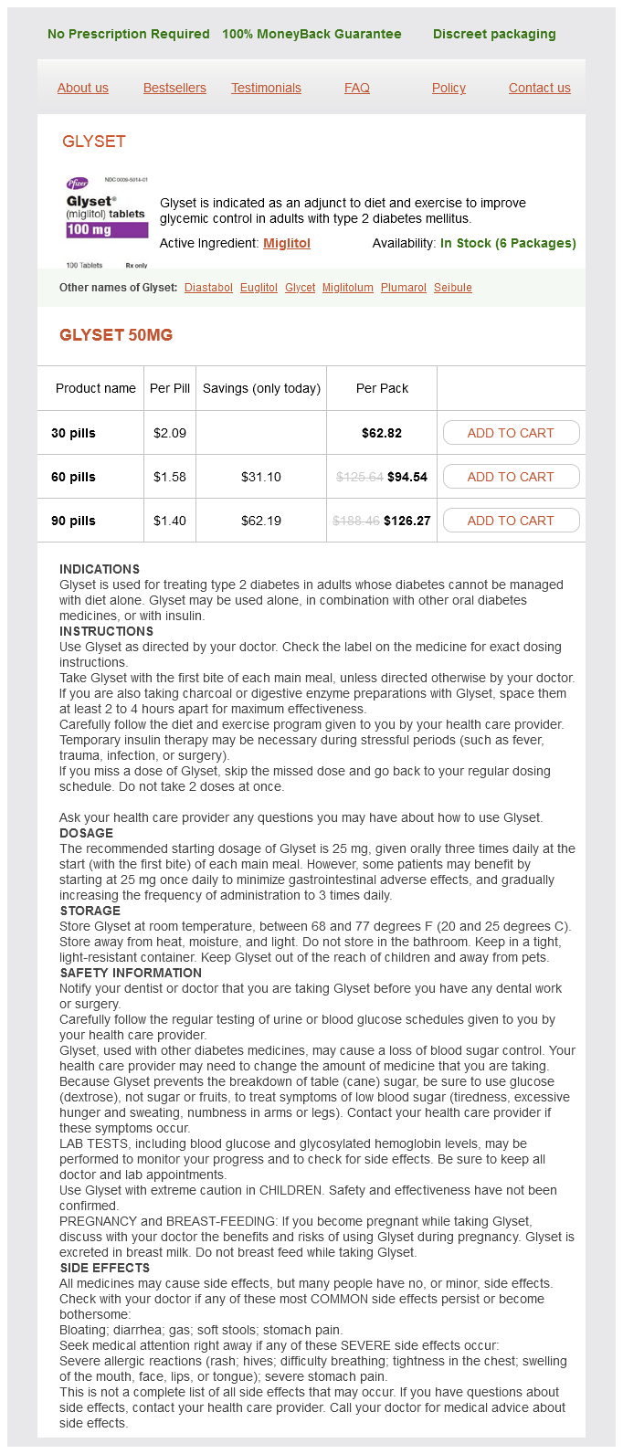 A harmful event that occurs while a patient is taking a drug 50 mg glyset order, irrespective of whether the drug is suspected of being the cause. An unwanted or harmful reaction that is experienced following the administration of a drug or combination of drugs under normal conditions of use and is suspected to be related to the drug. Any effect caused by a drug other than the intended therapeutic effect, whether beneficial, neutral or harmful. Some of these reactions are immediate and result from the interaction of drug antigens with immunoglobulin E (IgE) on mast cells and basophils, which causes a release of vasoactive biomolecules. Hypersensitivity reactions may occur via other mechanisms such as antibody-dependent (IgM or IgG), immune complex-mediated or cell-mediated pathways. Adverse effects of a drug that occur because the dose or plasma concentration has risen above the therapeutic range, either unintentionally or intentionally (drug overdose; see. The misuse of recreational or therapeutic drugs that may lead to addiction or dependence, serious physiological injury (such as liver damage), psychological harm (abnormal behaviour patterns, hallucinations, memory loss) or death (p. Both prescribers and patients tend to be more focused on the former but a truly informed decision requires consideration of both. The thalidomide disaster in the early 1960s highlighted the risk of teratogenicity and led to mandatory testing of all new drugs. Examples include osteoporosis caused by glucocorticoids, retinopathy caused by chloroquine, and tardive dyskinesia caused by phenothiazines. Examples include malignancies that may emerge after immunosuppressive treatment post-transplantation. In many cases, the patients are at increased risk due to their age, interacting drugs. These are predictable from the known pharmacodynamic effects of the drug and are dose-dependent, common (detected early in drug development) and usually mild. Examples include constipation caused by opioids, hypotension caused by antihypertensives and dehydration caused by diuretics. These are not predictable, are not obviously dose-dependent in the therapeutic range, are rare (remaining undiscovered until the drug is marketed) and often severe. Drug regulatory agencies may respond to this information by placing restrictions on the licensed indications, reducing the recommended dose range, adding special warnings and precautions for prescribers in the product literature, writing to all health-care professionals or withdrawing the product from the market. These are the most common interactions in clinical practice and some important examples are given in Box 2. Pharmacokinetic interactions occur when the administration of a second drug alters the concentration of the first at its site of action. Although the number of potential interacting drug combinations is very large, only a small number are common in clinical practice. Important drug interactions are most likely to occur when the affected drug has a low therapeutic index, steep doseresponse curve, high first-pass or saturable metabolism, or a single mechanism of elimination. Many health-care systems routinely collect patient-identifiable data on prescriptions (a surrogate marker of exposure to a drug), health-care events. As these records are linked, with appropriate safeguards for confidentiality and data protection, they are providing a much more powerful mechanism for assessing both the harms and benefits of drugs.