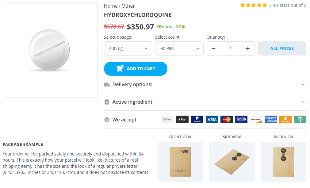 Hydroxychloroquine packs: 10 pills, 20 pills, 30 pills, 60 pills, 90 pills, 120 pills, 180 pills, 270 pills, 360 pills