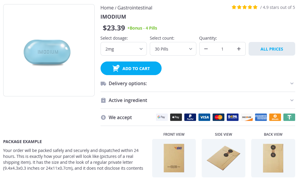 Imodium packs: 30 pills, 60 pills, 90 pills, 120 pills, 180 pills, 270 pills, 360 pills