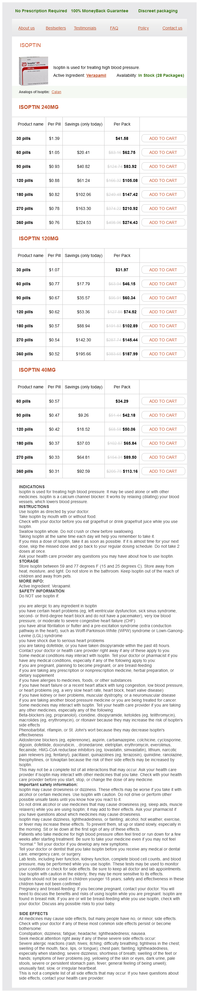 Isoptin packs: 30 pills, 60 pills, 90 pills, 120 pills, 180 pills, 270 pills, 360 pills