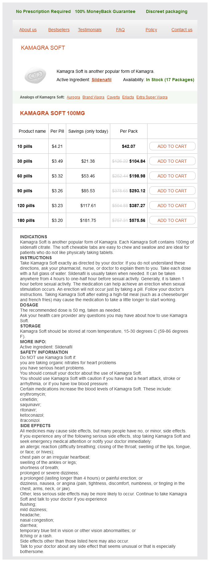 Kamagra Soft packs: 10 pills, 30 pills, 60 pills, 90 pills, 120 pills, 180 pills