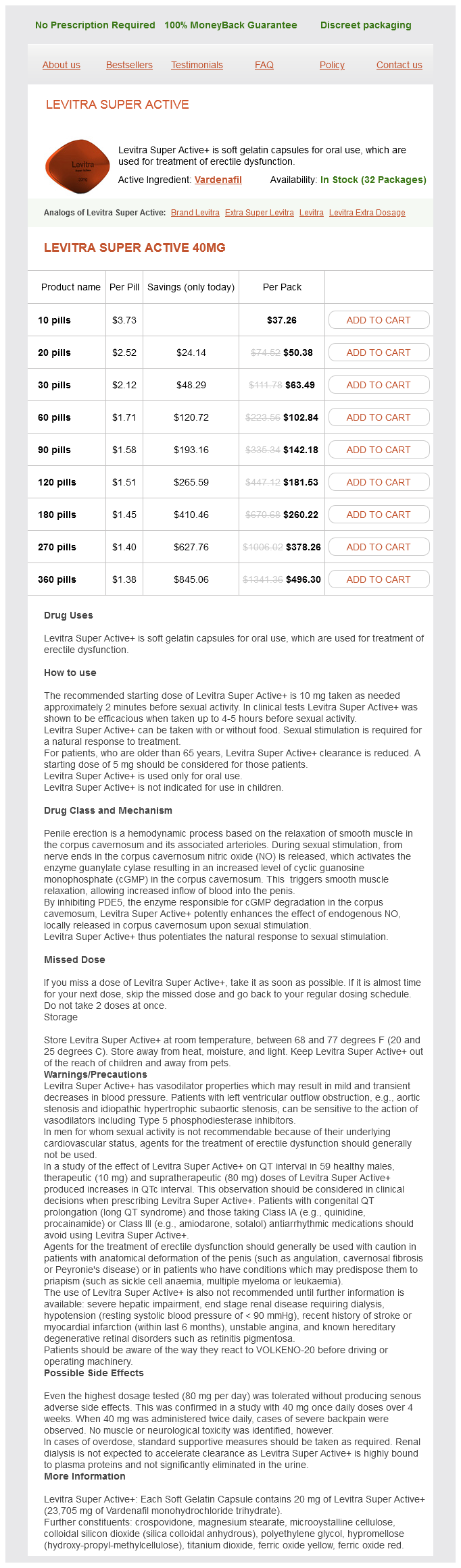 Levitra Super Active packs: 10 pills, 20 pills, 30 pills, 60 pills, 90 pills, 120 pills, 180 pills, 270 pills, 360 pills