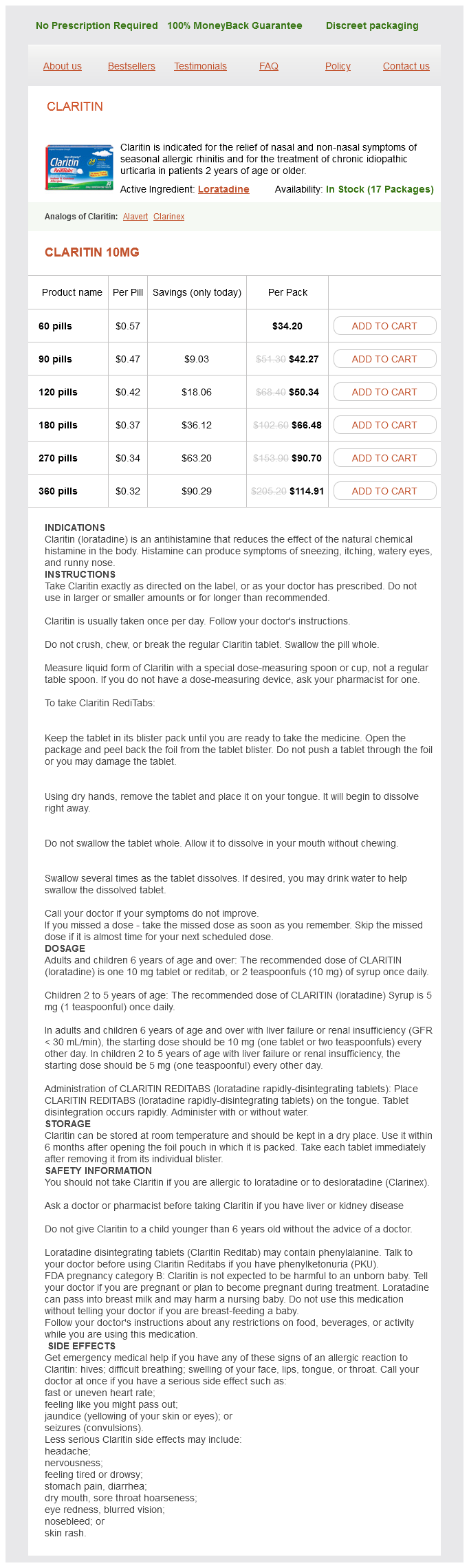 Loratadine packs: 60 pills, 90 pills, 120 pills, 180 pills, 270 pills, 360 pills