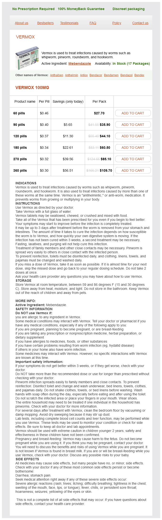 Mebendazole packs: 60 pills, 90 pills, 120 pills, 180 pills, 270 pills, 360 pills