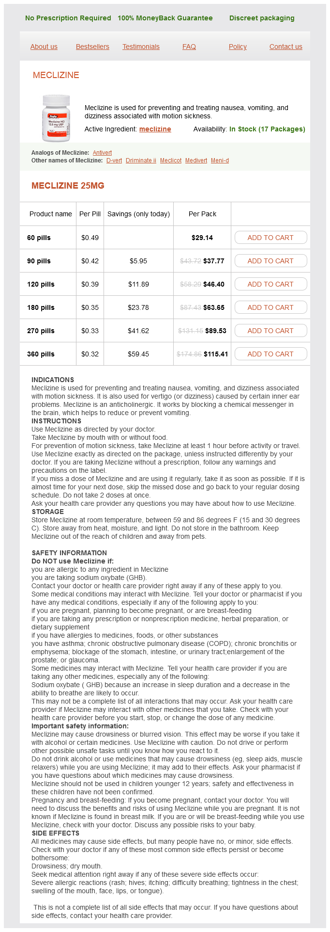 Meclizine packs: 60 pills, 90 pills, 120 pills, 180 pills, 270 pills, 360 pills