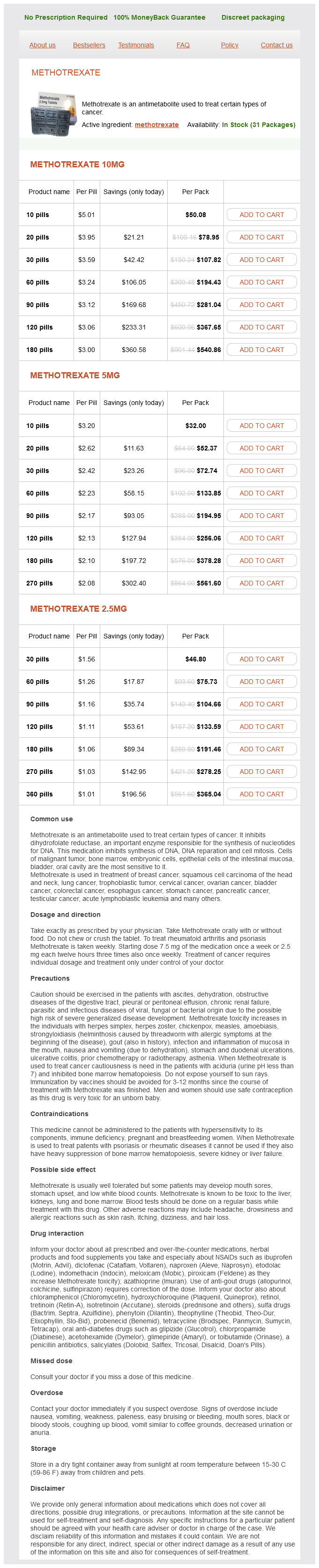 Methotrexate packs: 10 pills, 20 pills, 30 pills, 60 pills, 90 pills, 120 pills, 180 pills, 270 pills, 360 pills