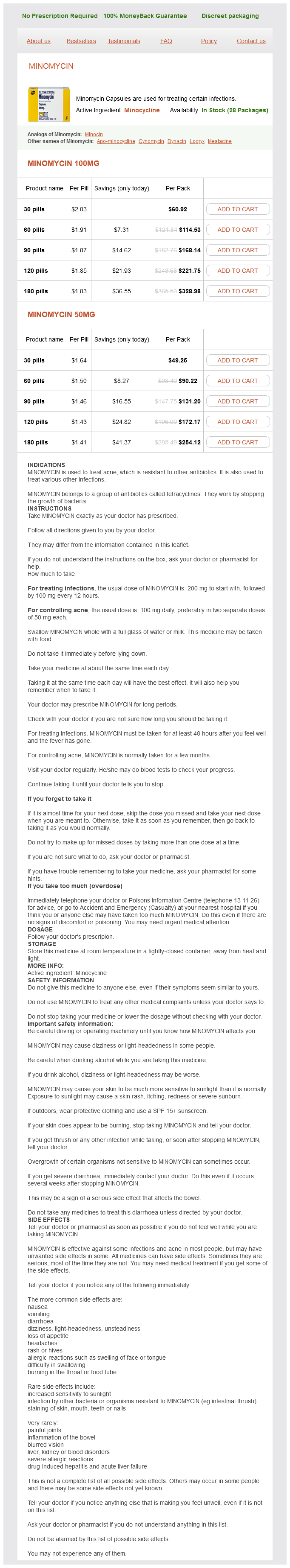 Minomycin packs: 30 pills, 60 pills, 90 pills, 120 pills, 180 pills