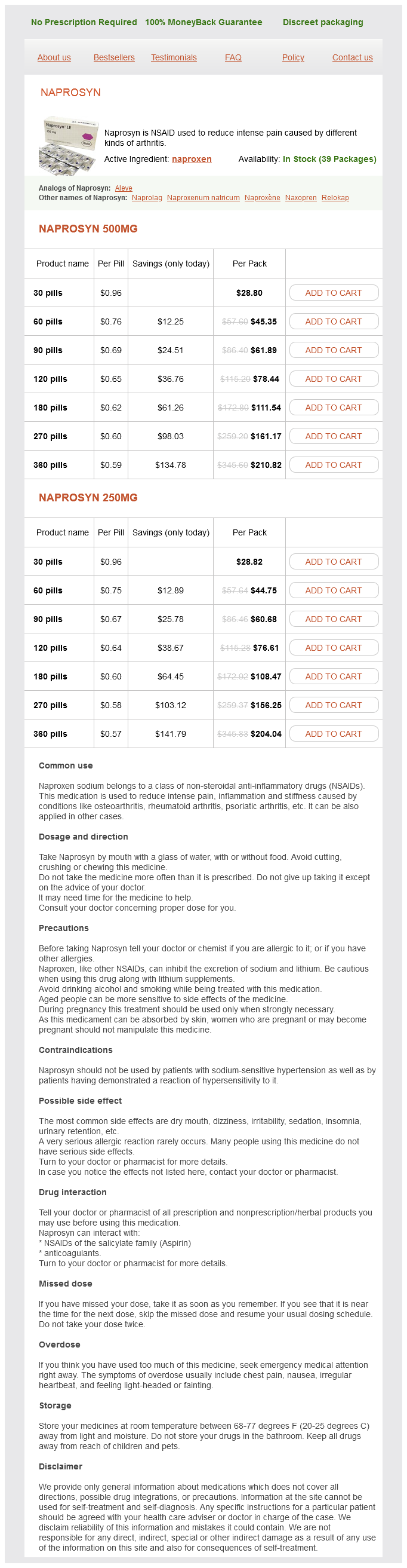 Naproxen packs: 30 pills, 60 pills, 90 pills, 120 pills, 180 pills, 270 pills, 360 pills