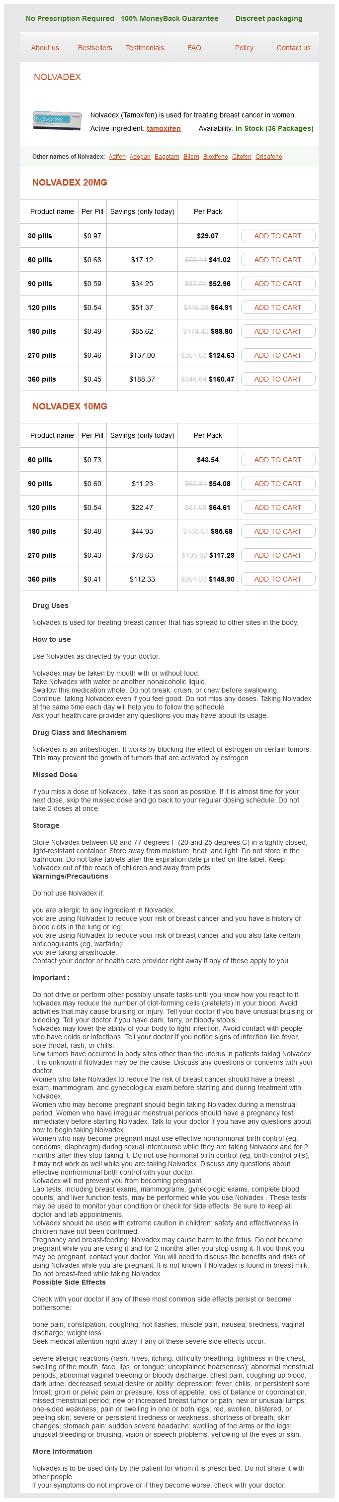 Nolvadex packs: 30 pills, 60 pills, 90 pills, 120 pills, 180 pills, 270 pills, 360 pills