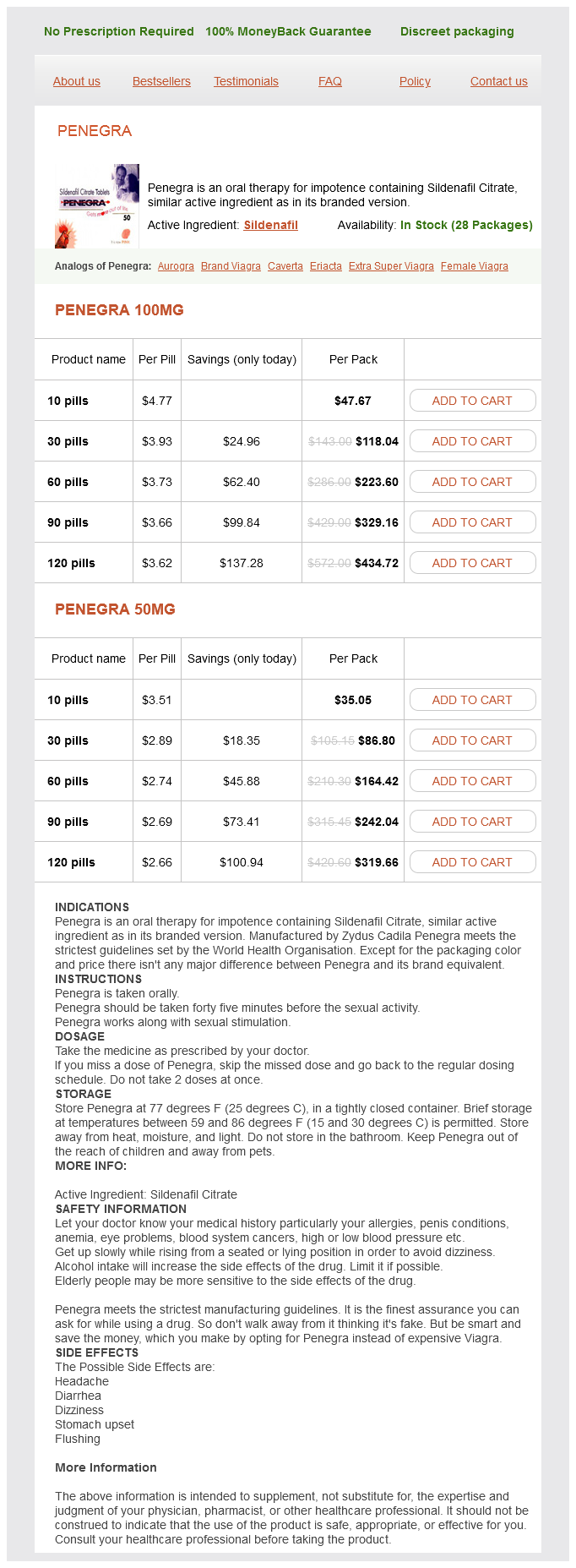 Persons with tuberculosis were once confined in sanatoriums and androgen hormone negative feedback generic penegra 100 mg buy, later, in locked wards of hospitals for six months. Today, persons under quarantine must remain in their homes, hospitals, or other designated health care facilities until cleared by a public health official or by a health care provider. Present Quarantine Use Quarantine is still used in cases of emerging and infectious diseases that are difficult to treat. Diseases for which people may be quarantined include cholera Cholera, diphtheria Diphtheria, tuberculosis Tuberculosis, smallpox, yellow fever Yellow fever, and Ebola Ebola virus and Marburg viruses Marburg virus. Quarantine plans were prepared but not implemented for the swine influenza A (H1N1) outbreak in the United Quarantine Category: Prevention Definition Quarantine Prevention quarantine is a state of compulsory Ethics quarantine or enforced isolation, confinement, or segregation to contain the spread of disease or other form of contamination. The word "quarantine" comes from the Latin term quaranta ("forty"), which referred in this case to the numbers of days of confinement for ships coming into European ports in the fourteenth century. Quarantine Prevention Quarantine Infectious Diseases and Conditions States in 2008. In 2014, a nurse who was serving with the organization Doctors Without Borders in Sierra Leone during the Ebola outbreak was quarantined in New Jersey and then Maine after her return to the United States. Quarantine is ineffective, however, for diseases in which the carrier is contagious before showing symptoms. In addition, lengthy quarantine periods raise human rights concerns, and the confinement of infected persons who refuse medical treatment remains controversial. Quarantine Impact In November, 2005, after debating the ethical and practical considerations of quarantine, the American Medical Association adopted guidelines, which are specified in "The Use of Quarantine and Isolation as Public Health Interventions. In October, 2006, the World Health Organization developed similar guidelines for addressing ethical issues in the planning of responses to pandemic influenza. Predictors of Quarantine Compliance During a Hypothetical Avian Influenza Pandemic: Results from a Statewide Survey. Quinolone antibiotics Category: Treatment Definition Quinolone is a synthetic antibacterial (antibiotic) drug that is not of microbial origin. Its synthetic origin stems from nalidixic acid, a by-product of the antimalaria compound quinine. The original quinolones consisted of nalidixic acid, cinoxacin, and oxolinic acid but were of limited use. Chemical modifications of these antibiotics produced an improved class of potent antibiotics known as fluoroquinolones. Fluoroquinolones are divided into several groups based on their broad spectrum of activity and their pharmacological properties. The best-known fluoroquinolones include ciprofloxacin (Cipro), moxifloxacin (Avelox), and levofloxacin (Levaquin). Mode of Action Quinolones generally exhibit concentration-dependent bactericidal tendencies. Pharmacology the ability of an antibiotic to successfully inhibit infectious bacteria depends on its pharmacological profile.