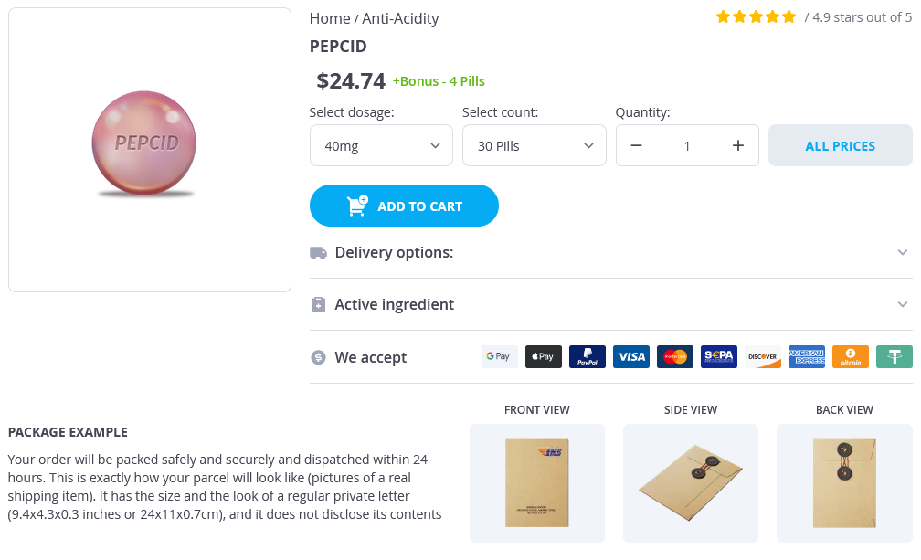 Pepcid packs: 30 pills, 60 pills, 90 pills, 120 pills, 180 pills, 270 pills, 360 pills