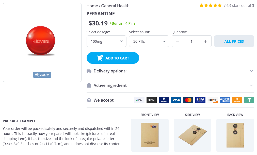 Persantine packs: 30 pills, 60 pills, 90 pills, 120 pills, 180 pills, 270 pills, 360 pills