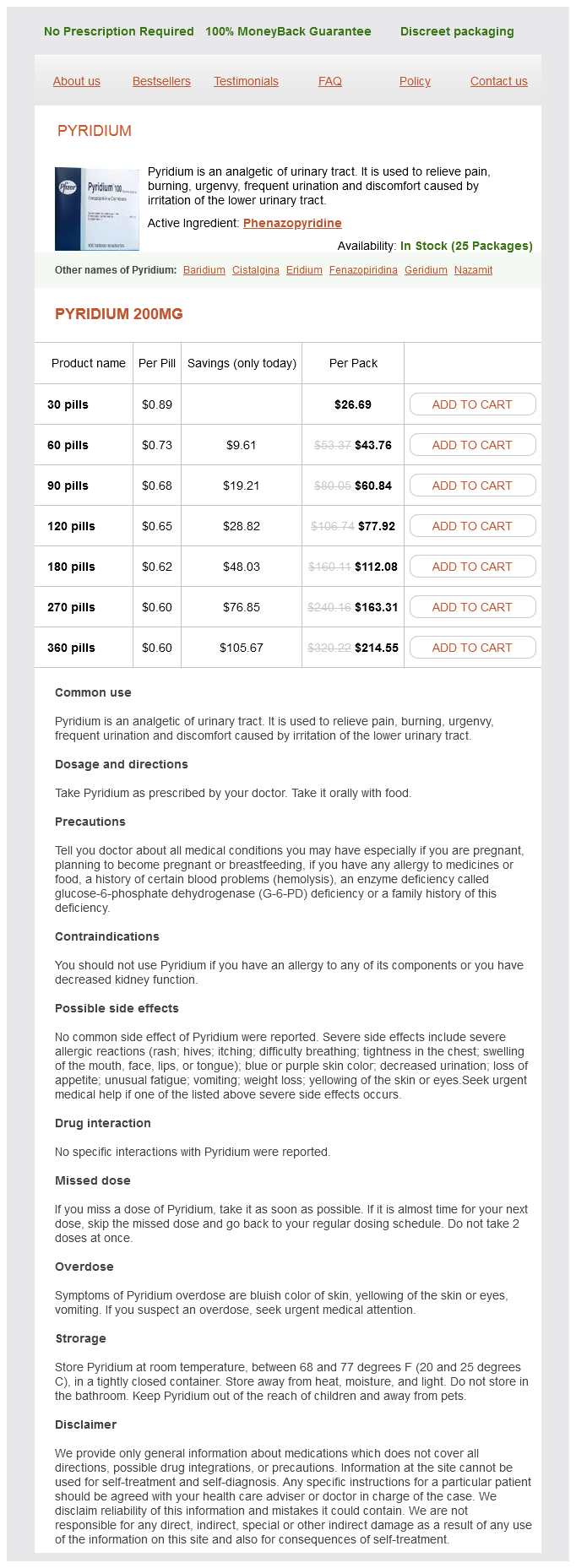 Phenazopyridine packs: 30 pills, 60 pills, 90 pills, 120 pills, 180 pills, 270 pills, 360 pills