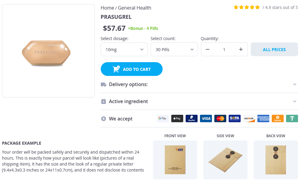 Prasugrel packs: 30 pills, 60 pills, 90 pills, 120 pills, 180 pills, 360 pills