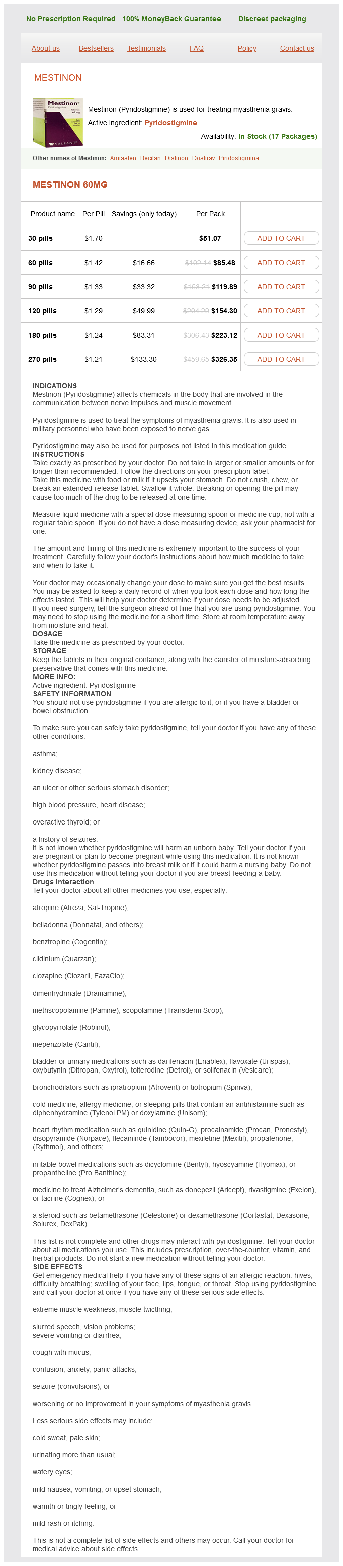 Pyridostigmine packs: 30 pills, 60 pills, 90 pills, 120 pills, 180 pills, 270 pills