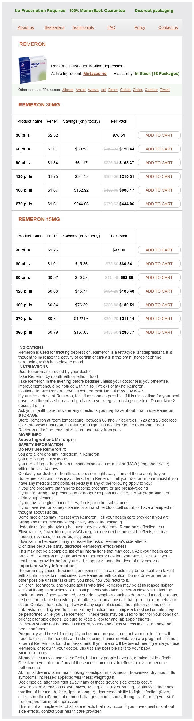 Remeron packs: 30 pills, 60 pills, 90 pills, 120 pills, 180 pills, 270 pills, 360 pills