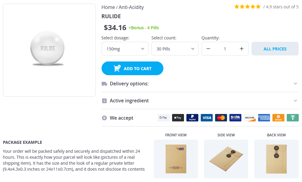 The prodrug of dopamine using carbamate linker synthesized medications contraindicated in pregnancy purchase rulide 150 mg free shipping, this formed prodrug released dopamine in brain. The problem of solubility was solved by preparing its prodrug with other anticancer drug molecules (cytarabine and melphalan). It was found that these synthesized prodrugs (parthabine (23) and parthalan (24)) were found to be superior but the cytotoxicity was found to be higher than parent drug taken. It involved the reaction of nitrogen present in anticancer drugs (cytarabine and melphalan) with the alpha-methylene-gamma-lactone group of parthenolide (Taleghani et al. Its biological activities were observed and checked in neuroblastoma and in C6 glioma cells. The results encouraged the scientists to go for studies using on the animal models of neuropathic pain and of neurological disorders and/or neurodegenerative diseases (Luongo et al. The prodrugs for zanamivir and oseltamivir as acylguanidine derivatives were designed. The acylguanidine derivatives of these drugs were synthesized with the aim that they can be given orally. The compound Amide phthaloylglycine (28) was found to be more active than standard galantamine. The data suggested that the most active molecule amide phthaloylglycine can be tested for in vivo properties and this might be beneficial for the drug design and to discover new drugs in pharmaceutical industries (Begum et al. At low dose also it has certain adverse effects like gastrointestinal toxicities, lethargy, fatigue, renal insufficiency and anemia. Most of the patients who take this medicine discontinue it within 3 years of therapy (Bannwarth et al. First, the total volume that can be administered via the nose is quite small (~200 L). Here the prodrug developed has lysine residue with drug and converting enzyme in an aqueous vehicle. This method, besides giving an aqueous media to deliver benzodiazepines, may also result in more absorption. Such developed prodrugs would be safer, allow intranasal administration of proper doses in small volumes, and result in earlier termination of seizures (Siegel et al. The azo linked prodrugs of drugs used against cancer like methotrexate, gemcitabine and potent analog of oxaliplatin were synthesized and characterized. Such drugs got cleaved in the colon with improved physicochemical properties, reduced toxicity and undesirable side effects. The analysis was done in rat fecal/cecum content and in intestinal mucosa, it occurred in presence of enzyme azoreductase which is responsible for the degradation and reduction of azo bond and drug release. So that the colon had maximal uptake of drug with minimal side effects (Sharma et al. Due to their high polarity they have limited effect as these drugs show low volume of distribution and low bioavailability (Eisenberg et al.