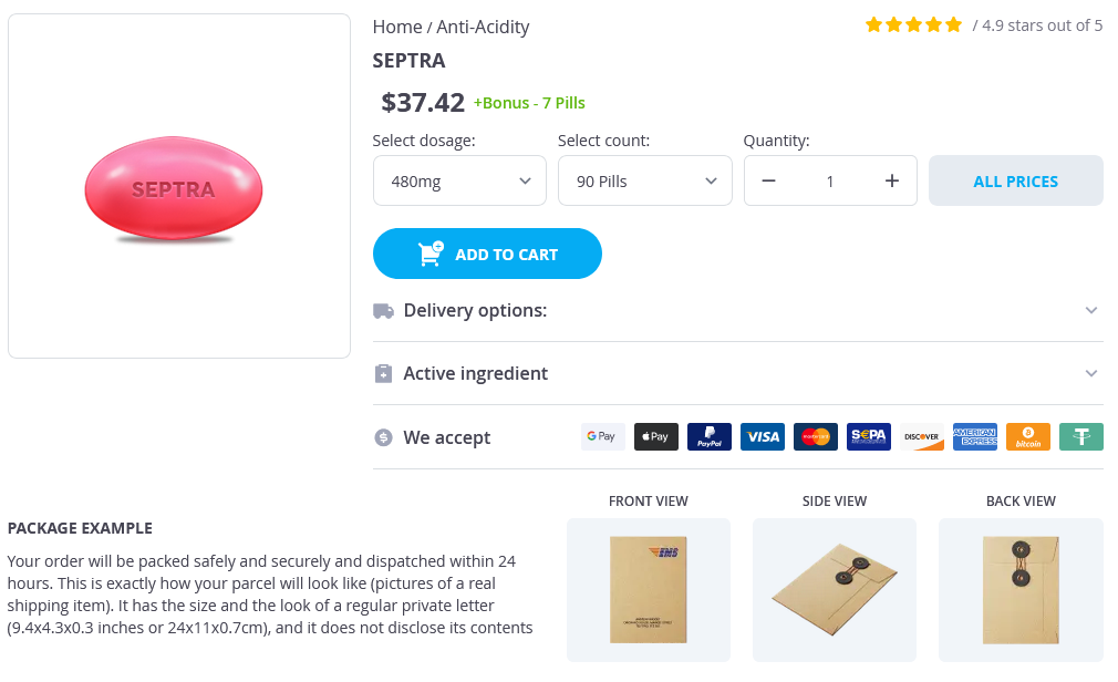 Septra packs: 90 pills, 120 pills, 180 pills, 270 pills, 360 pills