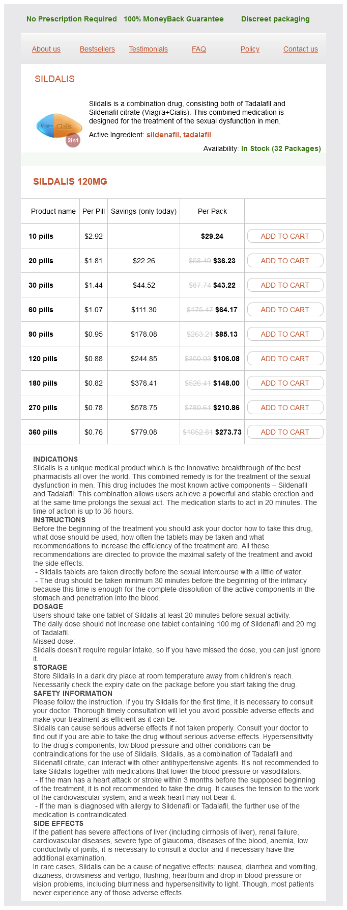 Sildalis packs: 10 pills, 20 pills, 30 pills, 60 pills, 90 pills, 120 pills, 180 pills, 270 pills, 360 pills