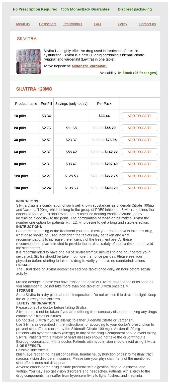 It is approved to decrease exercise-related symptoms and diminish clinical deterioration erectile dysfunction pump prescription silvitra 120 mg buy cheap. There appears to be an increased risk of Gram-negative bloodstream infections, especially in patients receiving intravenous treatment via a chronic indwelling catheter. It enhances the effect of nitric oxide in the corpus cavernosum and the pulmonary arterial smooth muscle. Common side effects associated with the use of sildenafil are headache, flushing, dyspepsia, epistaxis, and disturbances of color discrimination. The use of sildenafil is contraindicated with concurrent use of organic nitrates and guanylate cyclase stimulant riociguat. Its use is not recommended in patients with recent myocardial infarction or stroke within 6 months; uncontrolled arrhythmias, hypotension, uncontrolled hypertension, heart failure, or unstable angina. It should be avoided when severe aortic stenosis or dynamic left ventricular outflow tract obstruction is present. Once in the circulation, it avidly binds to the iron of heme-based proteins; it is rapidly inactivated by hemoglobin. The use of nitric oxide is favored in the treatment of pulmonary hypertension for its selective pulmonary vasodilator and antiproliferative effects. Chronic heart failure is a condition characterized by vasoconstriction, volume overload, and neurohormonal activation. The goal of its pharmacological management is to reduce vascular tone, reduce sympathetic activation, and improve cardiac function. It reduces the heart rate by inhibiting cardiac pacemaker inward "funny" current in the sinoatrial node, which, unlike beta-blockers or calcium channel blockers, produces selective heart rate control without affecting ventricular repolarization or myocardial contractility. It may prove beneficial for the treatment of heart failure with reduced ejection fraction. Sacubitril is a neprilysin inhibitor, therefore it increases the concentration of natriuretic peptides. It binds to vascular endothelial and smooth muscle A- and B-type natriuretic peptide receptors. Much like endogenous natriuretic peptides, it suppresses the sympathetic nervous system, the renin-angiotensin-aldosterone system, and endothelin. Digoxin is the only commercially available digitalis preparation available in the United States. It binds on the external alpha subunit, increases intracellular Na+ concentration, decreases Ca2+ efflux, and augments inotropy by releasing calcium from the sarcoplasmic reticulum into the cytoplasm, 224 M. Digoxin makes resting potential less negative with a resultant increase in myocardial excitability. The diminished amplitude or negative deflection does not correlate with serum levels. Caution should be used with concomitant use of beta-blockers, calcium channel blockers, or calcium. Dose should be reduced in hypokalemia, hypothyroidism, extensive myocardial or renal damage, and in geriatric patients.