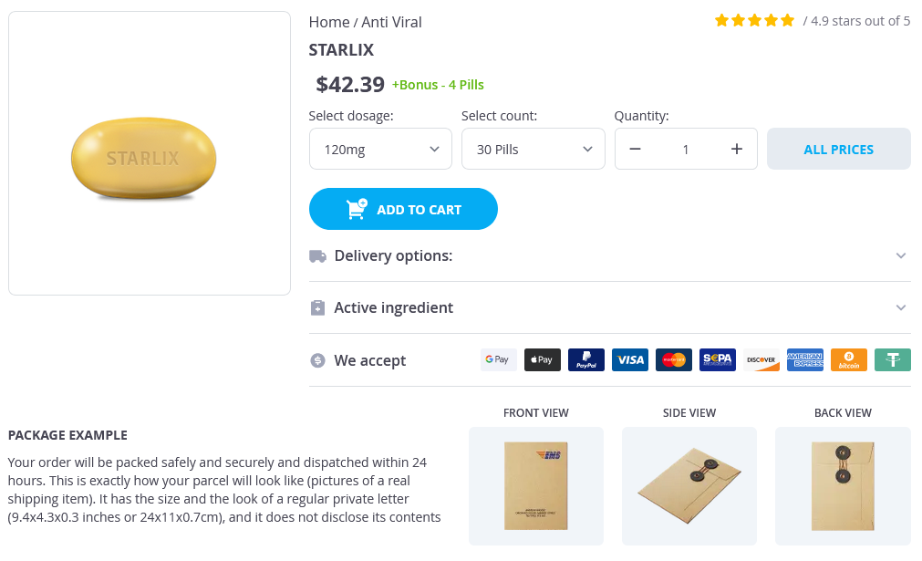Posterior tibialis tendonitis dysfunction occurs commonly in women aged 45 to 65 years antiviral spices generic starlix 120mg with visa. The foot is usually neglected in the physical examination but can be a source of lower extremity pain. Have the patient stand and put weight on his/her feet to see if there is excessive pronation (flat feet) or a high-arched cavus deformity. This is known as a "gait of pain" and usually indicates pain in the knee, ankle, or foot. This "gait of weakness" is similar to the coxalgic gait in appearance, but it is a result of weakness and not pain. Often there is a loud slap as the foot then hits the floor at the end of the swing phase. Guidelines for the initial evaluation of the adult patient with acute musculoskeletal symptoms. The dorsal 4-finger technique: a novel method to examine metacarpophalangeal joints in patients with rheumatoid arthritis. Common inciting events include infection, malignancy, trauma, tissue injury, or rheumatic disease. Surveys reveal that roughly two-thirds of laboratories across the globe use either modified automated measurements based on the Westergren method or alternative novel methods. Techniques based on the Westergren Downloaded for Anonymous User (n/a) at Egyptian Knowledge Bank from ClinicalKey. Many of these instruments use infrared light to measure the final length of sedimentation, with results measured at 1530 minutes depending on the instrument and then extrapolated to Westergren (60 minute) values. Results can be available in as little as 20 seconds to 5 minutes with some instruments. The influence of anemia, hyperfibrinogenemia, and other factors listed in Question #3 on methods utilizing photometric rheology is uncertain. Complete history and physical examination and routine screening laboratories (complete blood count, chemistries, liver enzymes, urinalysis). It is present in trace concentrations in the plasma of all humans and it has been highly conserved over hundreds of millions of years of evolution. Although its exact function is unknown, it shows important recognition and activation properties. In the absence of inflammatory stimuli, it falls rapidly, with a half-life of about 18 hours. Both tests measure components of the acute-phase response and are useful in measuring generalized inflammation.