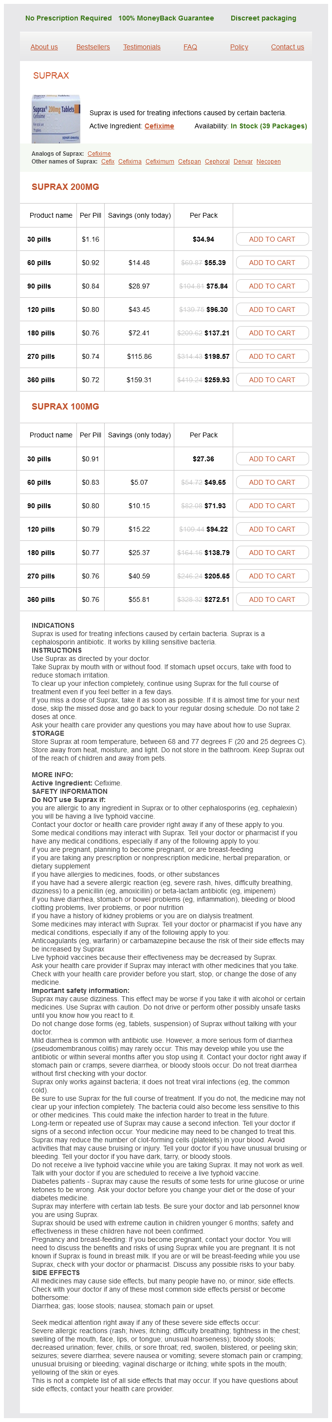 Suprax packs: 30 pills, 60 pills, 90 pills, 120 pills, 180 pills, 270 pills, 360 pills