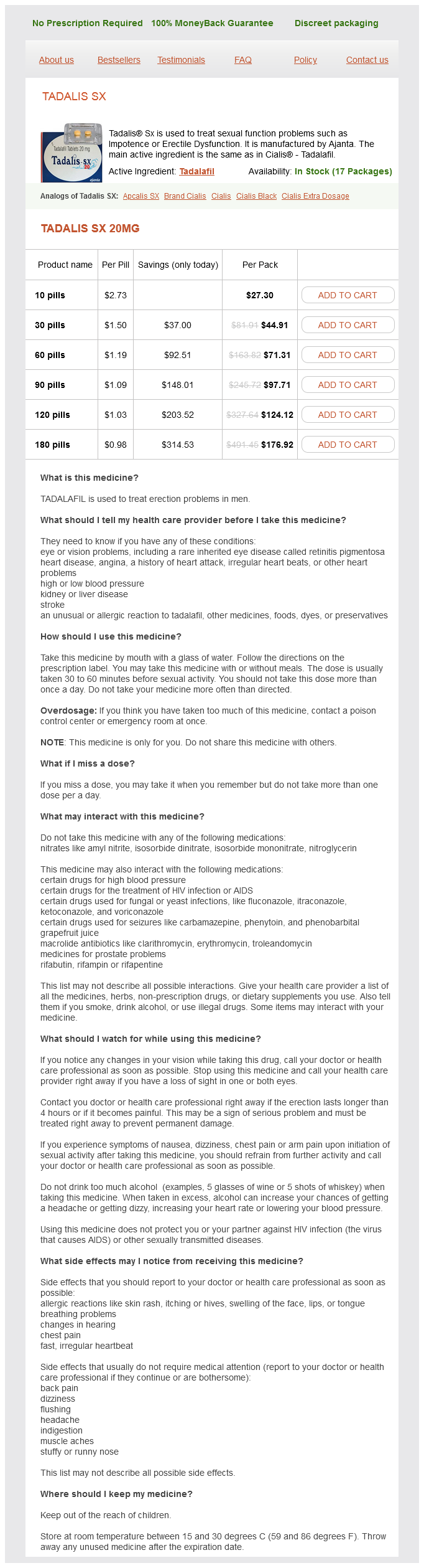 Tadalis SX packs: 10 pills, 30 pills, 60 pills, 90 pills, 120 pills, 180 pills