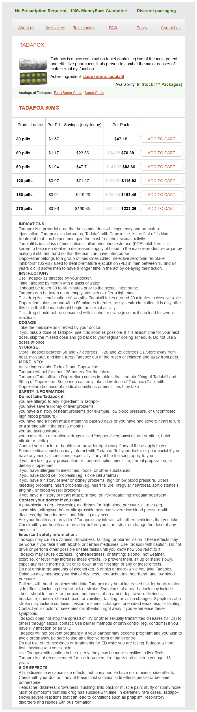 Tadapox packs: 30 pills, 60 pills, 90 pills, 120 pills, 180 pills, 270 pills