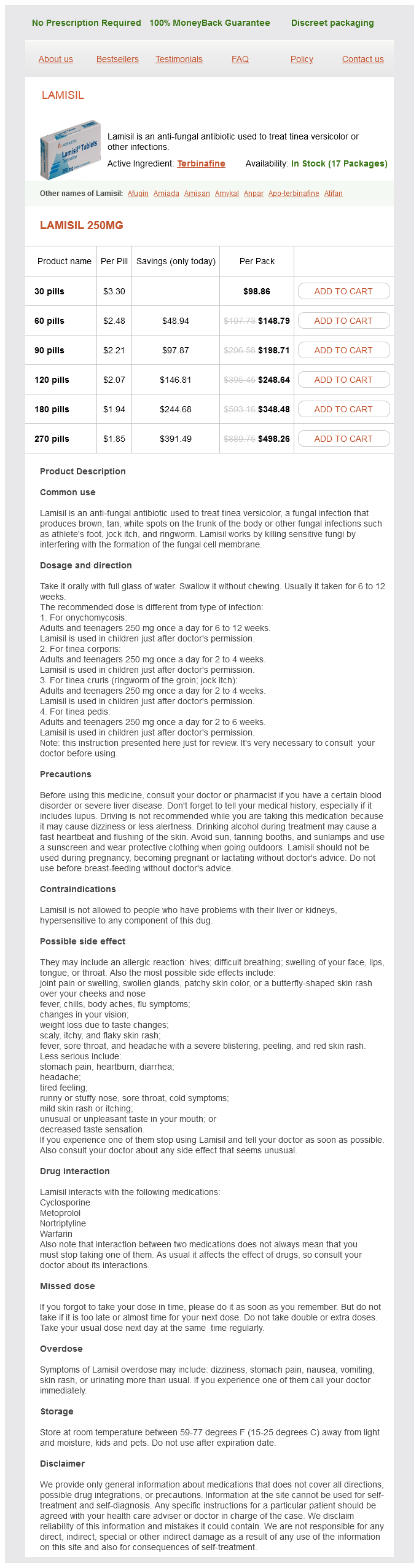 Terbinafine packs: 30 pills, 60 pills, 90 pills, 120 pills, 180 pills, 270 pills