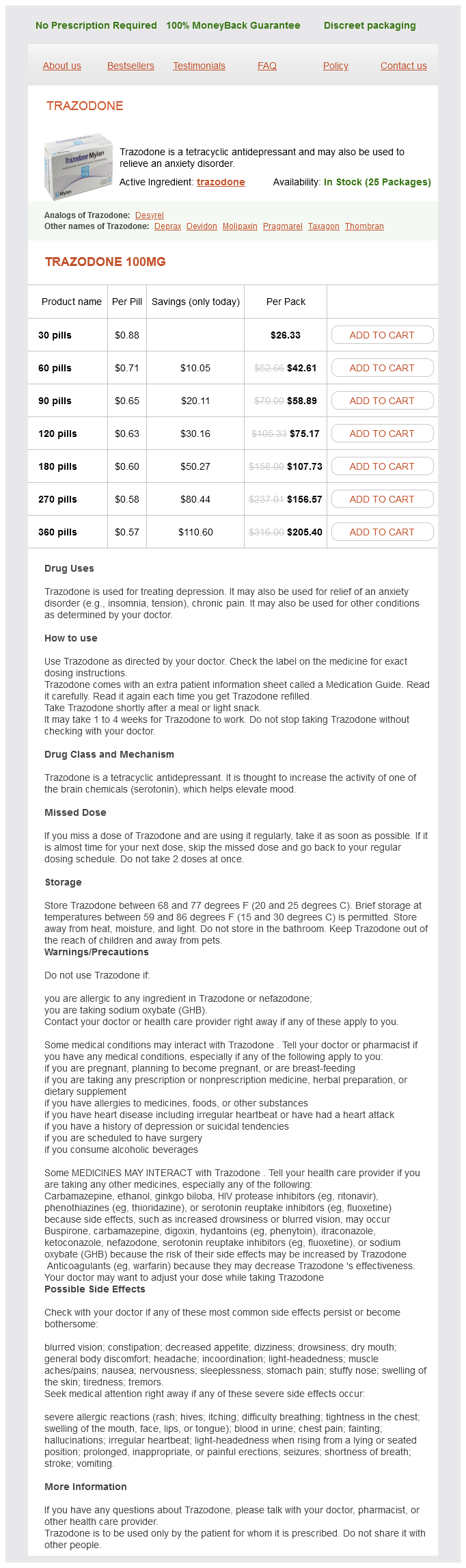Trazodone packs: 30 pills, 60 pills, 90 pills, 120 pills, 180 pills, 270 pills, 360 pills