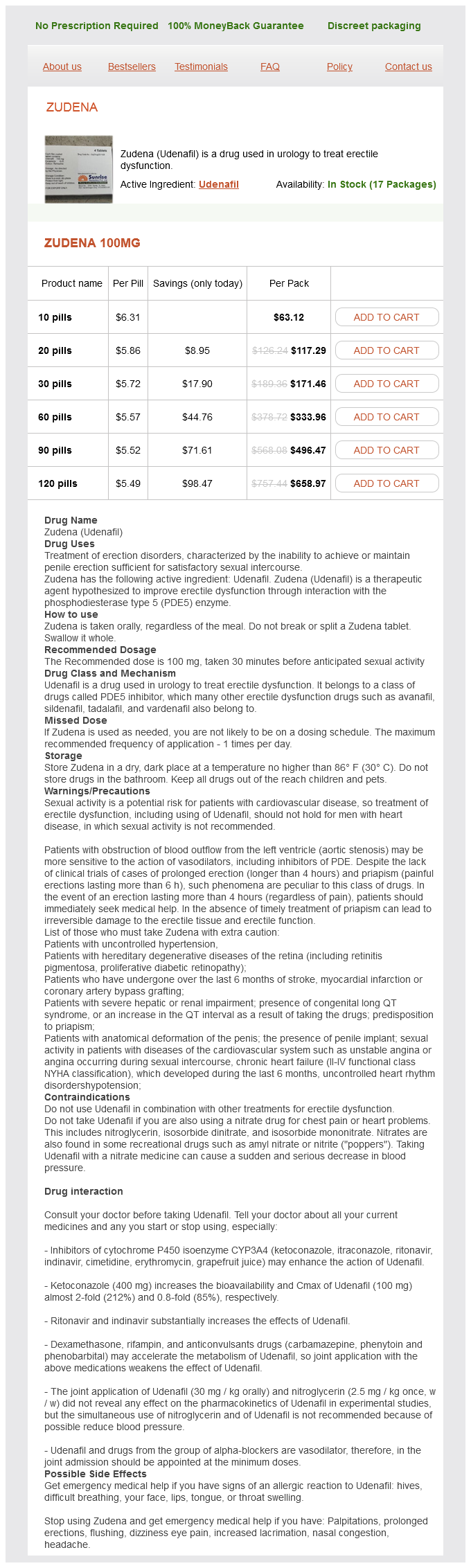 His urinalysis is positive for nitrite and leukocyte esterase with some bacteria identified but no squamous cells present erectile dysfunction yohimbe order udenafil 100 mg with mastercard. Renal ultrasound, post-void residual bladder volume, cystoscopy, and 7 day course of oral antibiotics 4. The patient can safely have intercourse 1 month after the procedure with little risk of pregnancy. The best course of management is administering parenteral antibiotics, percutaneous drainage of the fluid collection, and: A. Exploratory laparotomy, retroperitoneal exploration, and renal reconstruction nausea, vomiting, and a sharp right groin pain that started 6 hours ago. He is unable to find a comfortable position and moves around frequently in the hospital bed. He undergoes exploratory laparotomy and is found to have a left sigmoid colon injury, which is repaired primarily. Intravenous indigo carmine is administered, and no extravasation is seen from the ureter. Resect damaged ureter and repair with end-to-end ureteral anastomosis presents with pneumaturia, urinary frequency, and dysuria for several days. During mobilization and dissection of the sigmoid colon, the left ureter is injured. Resect injured segment and perform a primary end-to-end ureteral anastomosis over a stent B. Physical exam reveals an enlarged, firm, and tender left testicle with abnormal lie. He denies genitourinary trauma, drug use, or recreational use of phosphodiesterase-5 inhibitors. He had a similar episode 8 months ago that resolved spontaneously after 4 hours, but now he is having severe worsening penile pain. There are two kidneys, but humans can survive with just one without a clinically significant decrease in renal function or rise in creatinine. Gerota capsule surrounds the kidney while Glisson capsule surrounds the liver (C). The renal vein is the most anterior structure at the renal hilum, the renal pelvis is the most posterior structure, and the renal artery is between the two (A). Since the left side has a longer left renal vein, it is the preferred side for a donor kidney. The left renal vein is joined by the left adrenal vein superiorly, left gonadal vein inferiorly, and left lumbar vein posteriorly. This variant can present problems during infrarenal aortic surgery because the vein is prone to injury and difficult to repair. Scrotal discomfort accompanied by a mass that feels like a "bag of worms" and does not disappear while lying supine is suggestive of a varicocele. A scrotal mass that does disappear when laying supine and that transilluminates is likely to be a hydrocele.