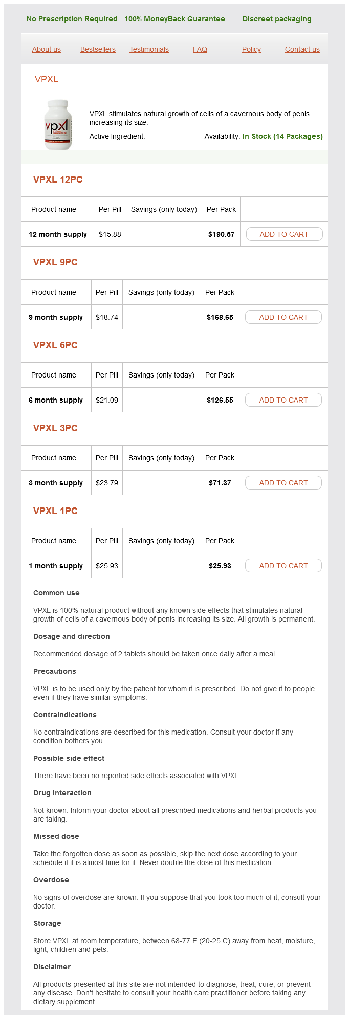 VPXL packs: 12 month supply, 9 month supply, 6 month supply, 3 month supply, 1 month supply