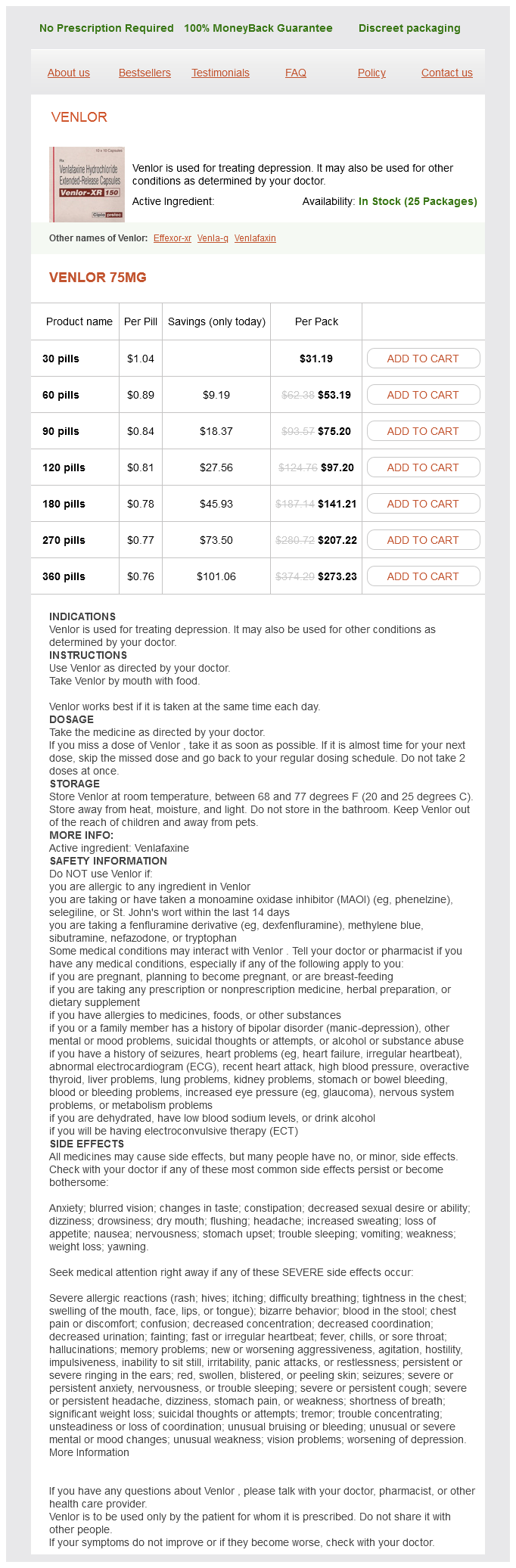 Venlor packs: 30 pills, 60 pills, 90 pills, 120 pills, 180 pills, 270 pills, 360 pills
