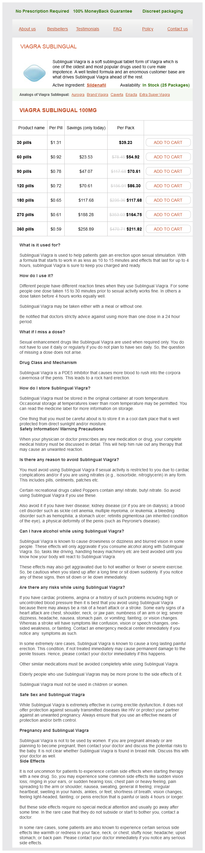 Viagra Sublingual packs: 30 pills, 60 pills, 90 pills, 120 pills, 180 pills, 270 pills, 360 pills