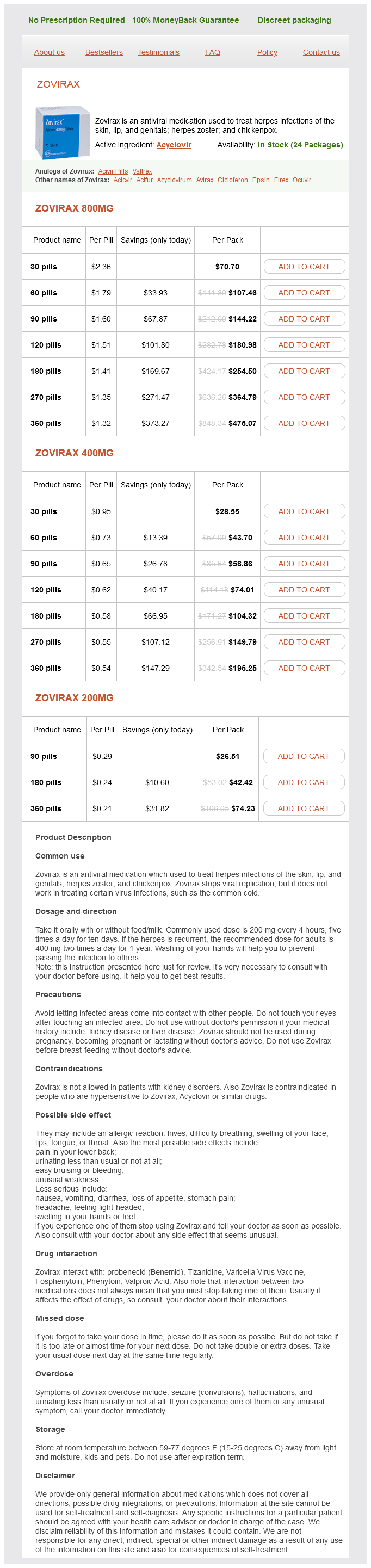 Zovirax packs: 30 pills, 60 pills, 90 pills, 120 pills, 180 pills, 270 pills, 360 pills