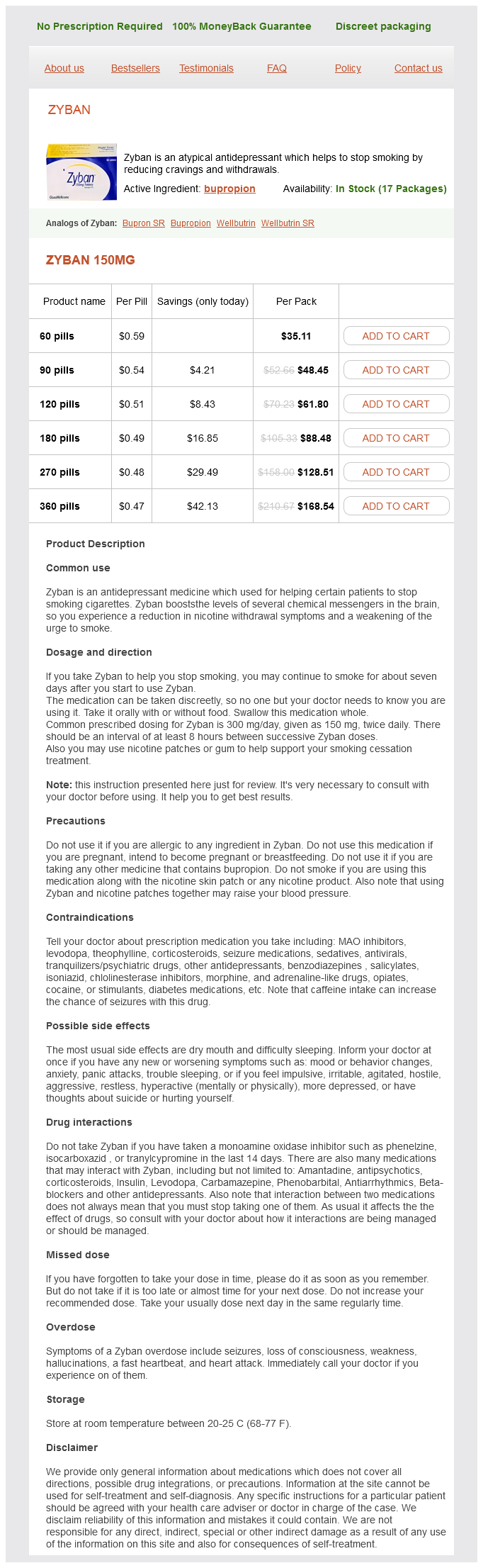 Zyban packs: 60 pills, 90 pills, 120 pills, 180 pills, 270 pills, 360 pills